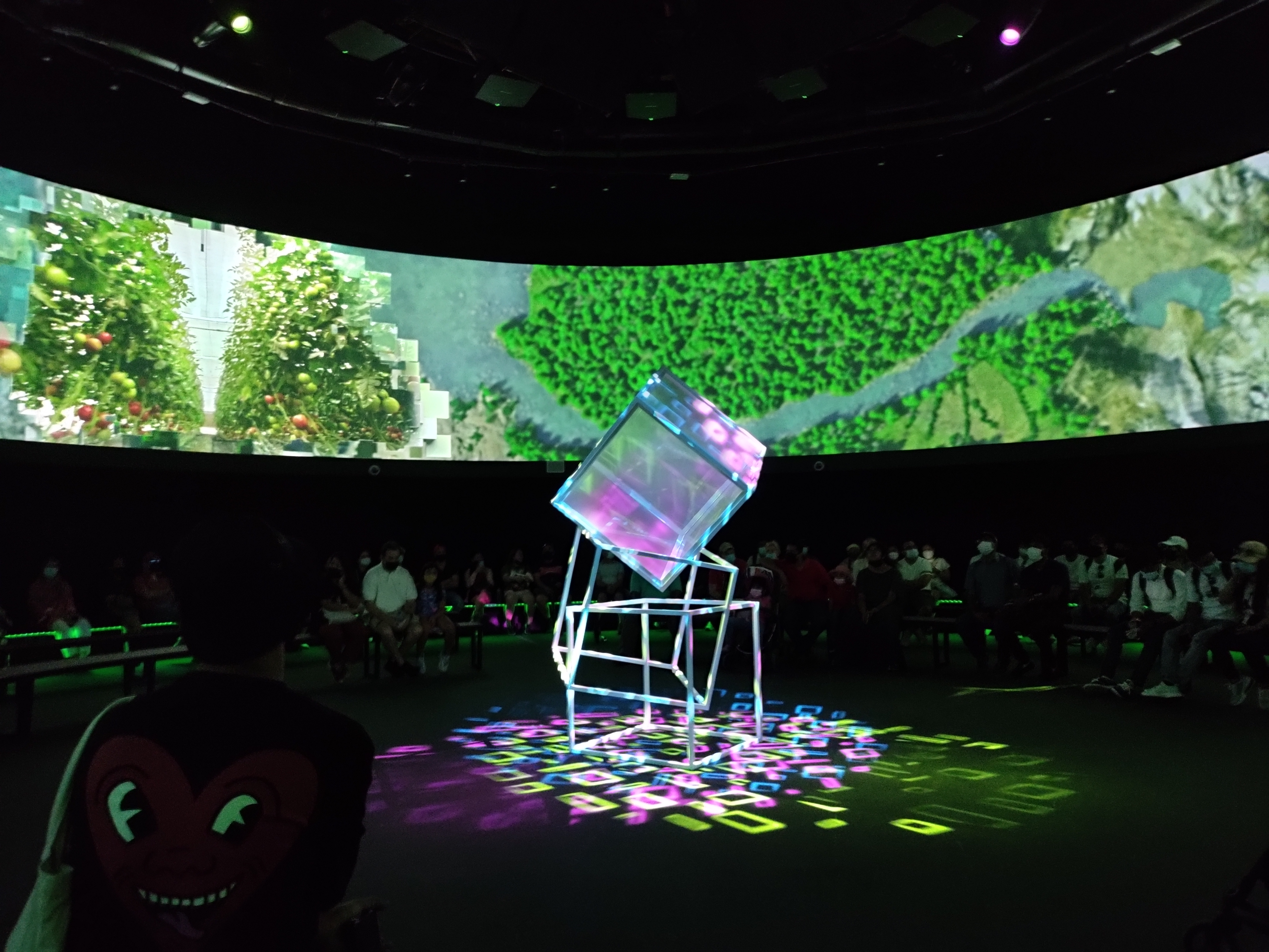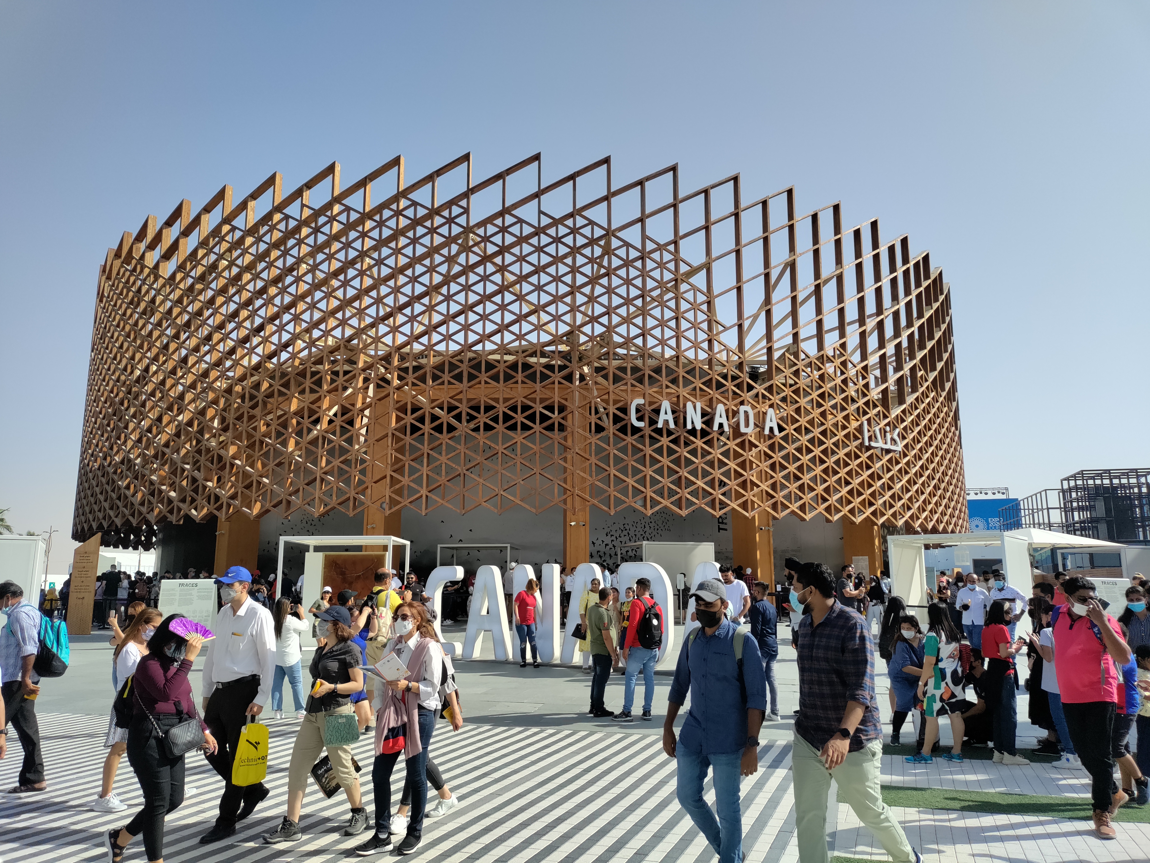 The inside of the pavilion was one large circular room with a cube in the centre (I think something to do with the birds) and some benches to sit on while watching a 360 degree video. Only a limited number of people were allowed to enter even though there were a bunch of open seats, meaning that people were being forced unnecessarily to wait outside in the heat. I am guessing this was a classic Canadian attempt to enforce social-distancing even though there were thousands of people attending the Expo every day without any social-distancing requirements at any of the other pavilions.