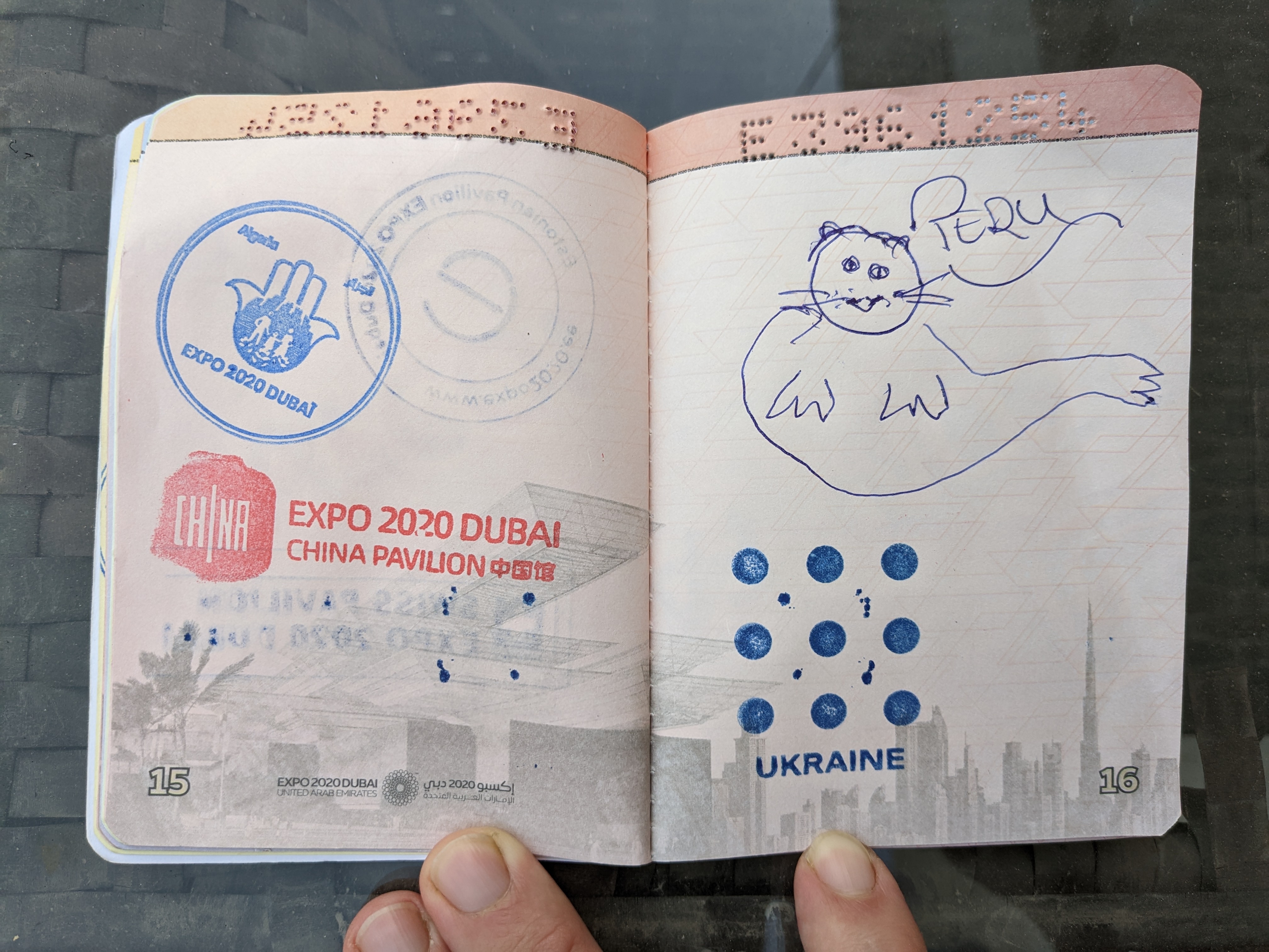 At the exit of each pavilion you could get a stamp in your Expo passport, and in total we visited 38 pavilions. I was very sad when Peru told us their stamp was broken and that they needed to get a replacement, so I instead got Jessica to draw one for us.