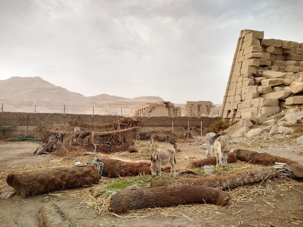 Our last site of the day was the Ramesseum, which was a short walk away. We took the wrong turn off the main road and then passed through some narrow streets weaving between nicely decorated small houses. We passed by a boy who gestured for us to continue around a corner (it was obvious to him what we were looking for), and then we emerged at the edge of some fields with some donkeys and the entrance in sight.