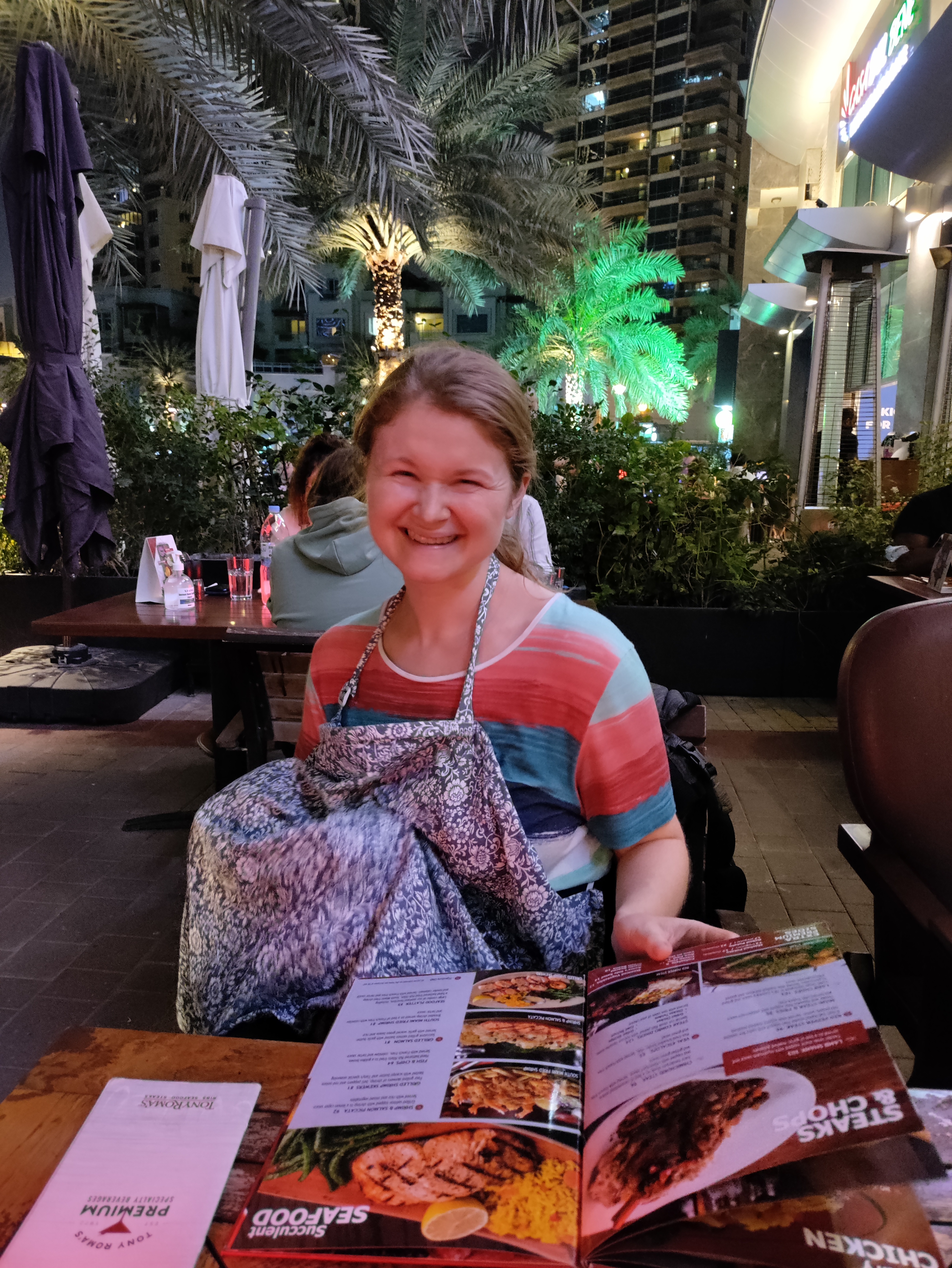 We decided to spend one evening out, and we started by walking around Dubai Marina. The walk was nice, and actually way less fancy than I expected, which I appreciated. We ate at Tony Romaās, a silly American chain restaurant that neither of us had been to before. The food was what you would expect, but it was busy and we had a great view and a wonderful time.